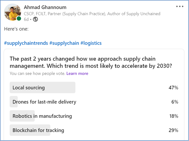 Of the four trends highlighted above, which is more likely to accelerate by 2030? I posed the question to my LinkedIn network; 47% of respondents singled out local sourcing as the most likely trend in supply chains. On the other hand, drones garnered the lowest score with just 6% of the vote (see screenshot at the bottom). Oh, and one more thing: spare a thought for Mr. Shmoe. In 2030, he continues to persevere on that treadmill.