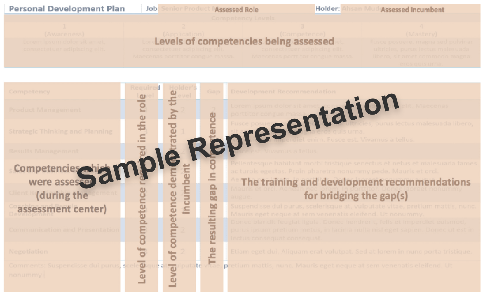 In Step 7, Meirc produces a Personal Development Plan (PDP) for each assessed candidate showing the competency gaps – if any, based on the assessment center. In this PDP, Meirc will list its recommendations for bridging the gaps and the timeframes in which such recommendations should be completed.